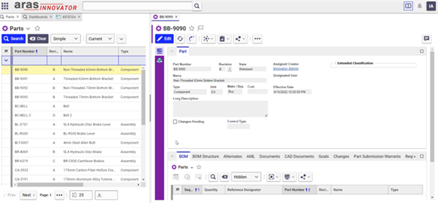 In recent versions of Aras Innovator, the ability to split your main screen in half has been a game changer for working across multiple items at once. In the top right corner, to the left of the notification bell, you can see the split-screen button. Clicking this button will move all of your current tabs to the left, while any new tabs that you open will be opened on the right. You can change how much of the screen each tab takes up, allowing you to customize your workspace for your own needs better.