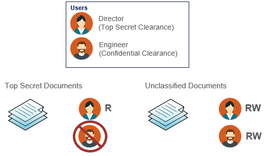 Mandatory Access Control (MAC) policies are attribute-based, meaning access can be defined based on properties/attributes of both the user and any item the user is viewing. This allows for military-style security scenarios, where a user with a high security clearance level may access items with a lower security clearance level, even though they may not have access provided by the explicit permissions defined on the item. This image shows how a MAC policy can be used to restrict access on documents with a "top secret" clearance level while allowing all users access to unclassified documents.