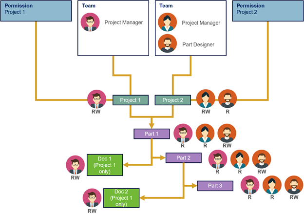 Each project in the above example could have its own DAC definition, meaning each project can have its own specific policy. Each user can be a member of multiple teams, giving them access to multiple projects. DAC policies work out of the box with the other two types of access control. Combining all three methods is the best way to ensure that authorized users are the only ones with access to the correct items. With proper configuration, you can have more complex policies, which allow for something similar to the diagram below.