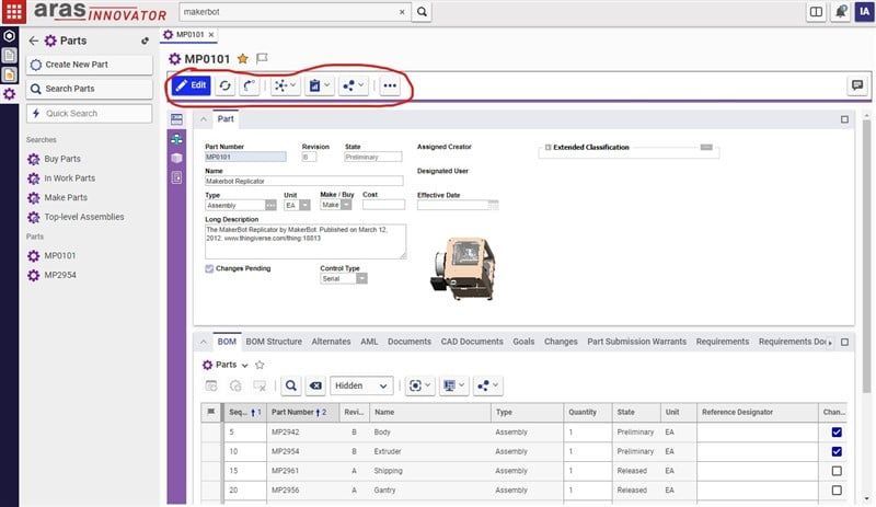 Toolbars are often seen on relationship views, giving options for interacting with what you see. Some change individual relationships, while others act on all the options you see. Of course, Aras Innovator prides itself on being configurable, so you can add buttons that do all sorts of things here, but it’s best to remember what information is close at hand. Nothing stops you from adding interactions to affect the item itself, but it would be unintuitive. For a closer look at how CUI and toolbars work, take a look at our article here. Like ItemViews, toolbars have many formal locations. You can see most of them by searching "*toolbar*" in any locations search.