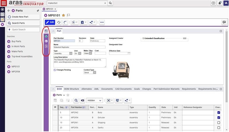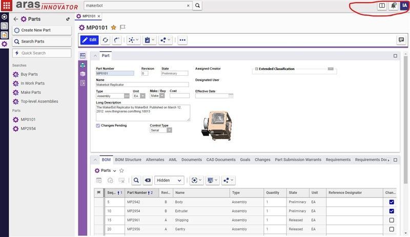Having exhausted the options going straight down, lets look to the side! Sidebars generally appear next to an item, and don’t move when you scroll up and down on that item. Add something to the sidebar when you want to display something a little outside Aras Innovator’s usual approach. Toolbars, item views, and headers are all general purpose tools that you’ll see repeated whether the item is a part or an incident report or a project. Within sidebars, you’ll find attached files viewed right in Aras Innovator, or three dimensional views of CAD parts. By clearing the screen of other information, you can put whatever it is you need to see front and center, and always go back the same way you got there- the sidebar. The location name for this is ItemWindowSidebar.