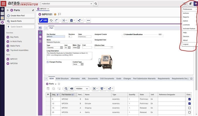 There are lots of menus in Aras Innovator. From search grids to navigation to the big user menu at the top right, the ability to alter menus means the ability to add or gate a lot of capability. It’s hard to give general advice for menus, because they come in so many varieties. Fortunately, menus are where you can give the most detail and description: a menu doesn’t need to be an icon, but can be written words. Further, menu options show up alongside each other, meaning they can give each other context as well as be informed by where the menu shows up. After all, if you right click an item from a search grid, “open” and “promote” obviously refer to the item you clicked on, and a user would similarly understand “share” would work the same way. You can read more about CUI and menus here, and we encourage you to do so: menus are one of the more common places to add functionality to Aras Innovator.