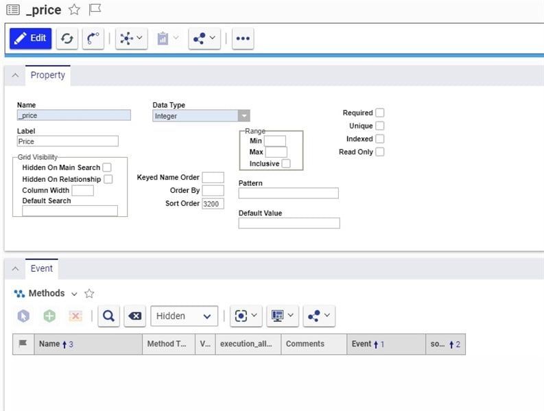 OnEditStart is an event that begins as soon as you begin to change the property. A method here that might be useful would be one that set a related property, for instance if you had one property for whether a purchase order had multiple associated delivery dates then beginning to edit the field for the second date could alter the first property without needing to manually do it. OnEditFinish will activate when someone is done editing and clicks away, and here it can sometimes be useful to bring up a confirmation message in the case where the information would be both unusual to change and very important to get right. There’s also the OnEdit event, should you have need of that.