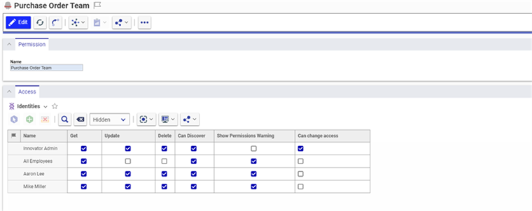 Let’s say we want to create a custom Permission called Purchase Order Managers for users who should be able to create, get, update, and discover Purchase Orders. In our example we will add two individuals, Mike Miller and Aaron Lee, to our new Permission. We also want to allow all employees to be able to read, get and discover these items but not be able to edit them. Innovator admin should also get all privileges managers receive including the ability to change access.