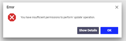 Since Mike Miller has update privileges, we can select the edit button and change the price to 30. We can take this a step further and test to make sure the All Employ identity truly does not have the same update access. This means they should only be able to read, get, and discover. Log out Mike Miller and sign back in as Terry Adams who is part of the All Employees identity. Go back to the Purchase Order we created and try to make an edit; you should receive the following error: