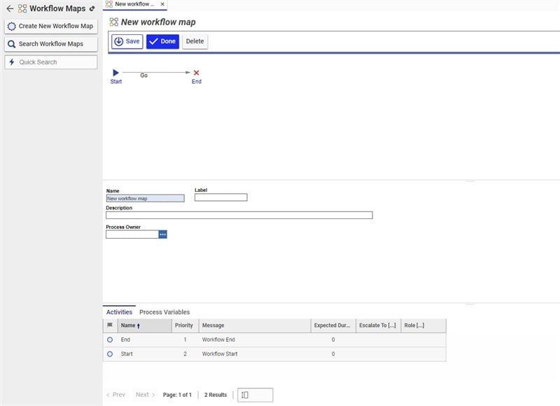 - You’ll see a form open up. It has three main parts- a visualization of your map, some details about your map like Name and Description, and the relationships your Workflow Map has.