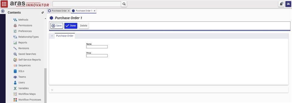 After a moment, Aras Innovator will finish creating a number of system properties that every ItemType has, as well as making things like the associated form. Once that’s finished, we can customize our Purchase Orders.