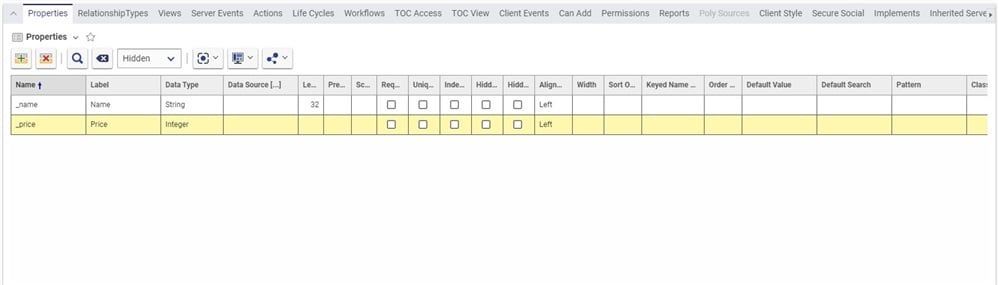 We also want a Price property in our Purchase Orders. We can repeat the process we used before; make a new row, enter something like “_price” for the name of the property, “Price” for the label, and this time giving it the DataType of Integer. Now you understand how to make properties and can add as many as you need. Or more than you need. We're not going to stop you.