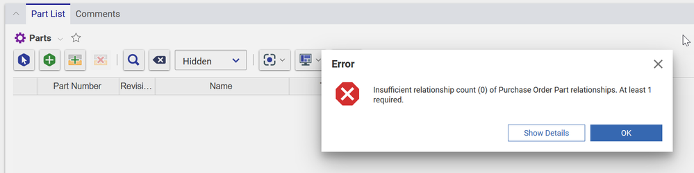 Let’s open up the Purchase Order Part RelationshipType for editing (not the ItemType!), which can be found under Administration > RelationshipTypes > Search RelationshipTypes. When a new Purchase Order is created, we want at least one Part to be attached to it before it can be saved. To ensure that this happens, we’ll set the Minimum Occurrences (in the Related group box) to 1. Now, save and unlock the Item and we’re done! We can test this out by creating a new Purchase Order and trying to save the Item without adding a related Part; an error dialog will be shown to us indicating what the problem is.