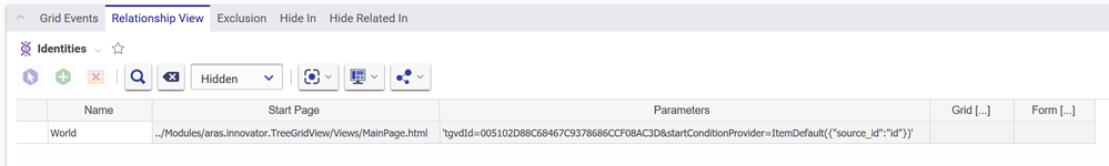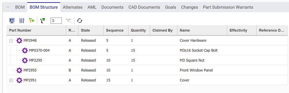 The Relationship View for Part Multilevel BOM has the Start Page pointing to the Tree Grid View main page. In order for this page to display the Part Item’s data correctly, we also need to pass in Parameters such as the ID of the Tree Grid View and a start condition with the source ID of the Part Item. When we open the BOM Structure Tab on a Part that’s an Assembly, we can see the entire bill of materials in an expandable list.