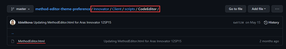 We can see an example of this in the Method Editor Theme Preference community project. This community project adds an option for developers to change the theme they want to use for the standard Method Editor. To accomplish this, we needed to modify a file in the codetree that controls how the Method Editor gets loaded, and if we look at the files included in the community project, we'll see that it includes a relative path down to the /Innovator/Client/scripts/CodeEditor/MethodEditor.html file.