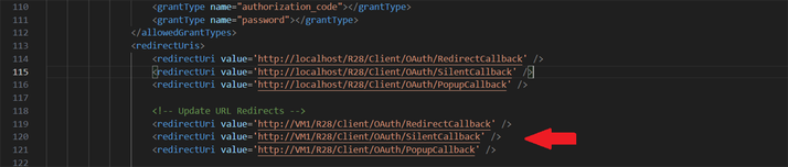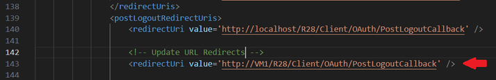 - Next, we will update the <postLogoutRedirectUris></postLogoutRedirectUris> tags similarly. Simply by copying the first redirectUri tag and pasting it below the original, changing the server name within the URL from localhost to VM1: