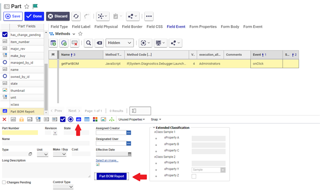 - Go to the Field Event tab and select the add method button, then search for and add our "getPartBOM" method
