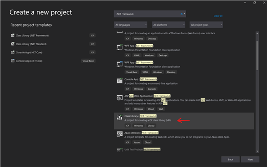 - Search for .NET Framework and select the Class Library (.NET Framework) for C# class library(.dll).