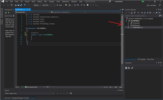 - Now on the right side of your newly created project there will be a Solution Explorer. Right click on Class1.cs and rename this to PartBOMDLL.cs and say yes to renaming the project all the references for Class1.