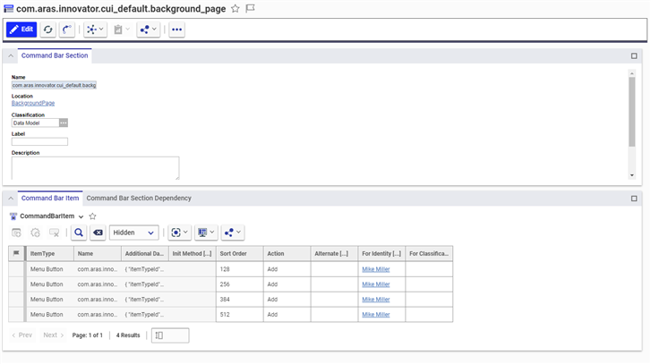 6. Click the edit button and then the select items button in the relationship grid below to add a commandBarItem
