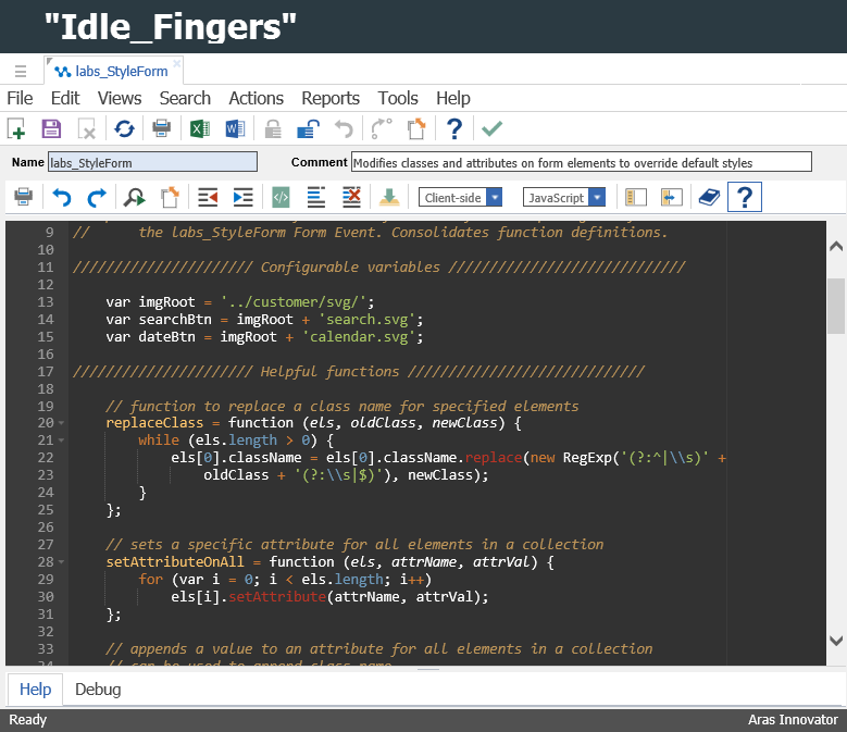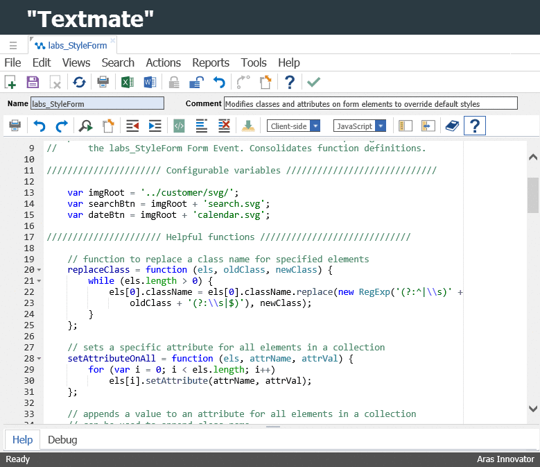 If you've ever wanted to change the theme of the Aras Method Editor, this is the post for you! With the following quick and easy tweak, you can change the colors and fonts used to display method code in the editor.