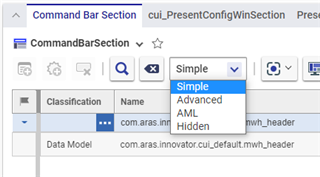 - Once com.aras.innovator.cui_default.mwh_header form is opened, in TAB "Command Bar Item" change the Search from Hidden to "Simple"