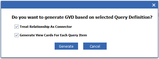 If you select the Generate View Cards For Each Query Item option, a unique view card is generated for each Query Item and added as a GVD Default View Card. The generated view cards will have a row for each property selected for the Query Item in the Query Definition. We'll select this option so we don't have to worry about mapping the query results to an existing View Card.