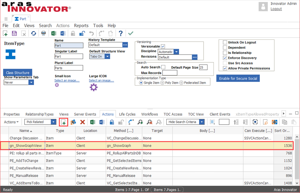 - Search for the gn_ShowGraphView Action and double click to add it to the Part ItemType's actions.