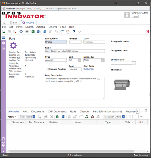 To confirm that the form event works, navigate to Design > Parts in the table of contents and open any Part for viewing. The first relationship tab should be the Alternates tab, and the BOM and BOM Substitutes tabs should not appear at all.