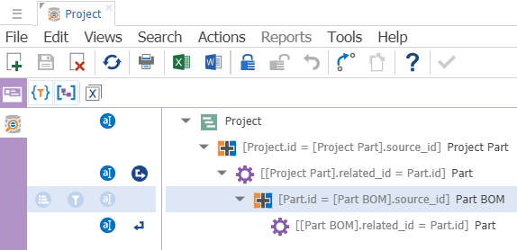 The Query Definition below will select all of the parts related to a project plan, including parts related through the BOM.
