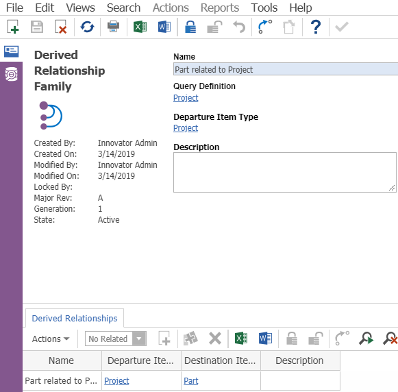A Derived Relationship (DR) Family describes the derived relationships between Innovator items. Each Derived Relationship in a DR Family has its own destination ItemType and name. An individual DR is referred to as a DR Family Element. All DR Family elements share the same departure ItemType as determined by the Query Definition.