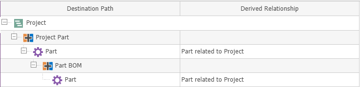 You can add a Derived Relationship to the item, and set the Destination Item to Part. Once you've configured your DR Family like the one above, navigate to the editor on the left. Here you will see a consolidated view of your Query Definition you defined earlier. You'll want to set your newly created Derived Relationship on each Part item within the Query Definition. It should look like the screenshot below.