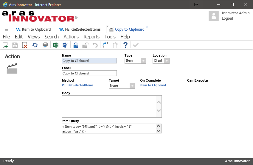 Actions are one of the most common ways users interact with data in Aras, whether from the main grid, item forms, or main menu. While creating custom actions is fairly straightforward, creating multi-select item actions requires the use of a built-in method called PE_GetSelectedItems. This post demonstrates how to use PE_GetSelectedItems to implement a multi-select item action that copies property data from the selected items to the clipboard.