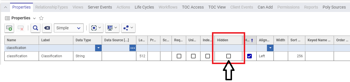 - Under properties, search classification for the name and un-select the first Hidden attribute. Do the same with the property keyed_name.