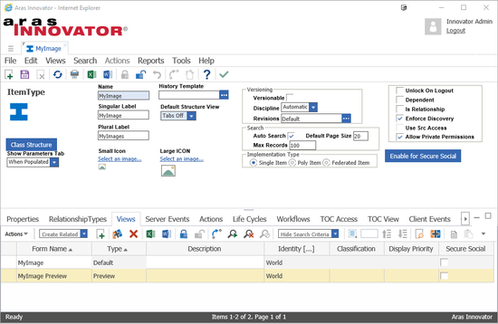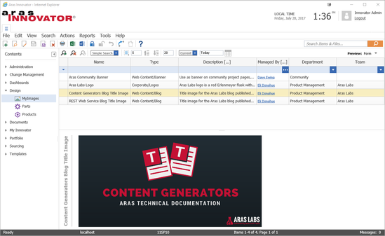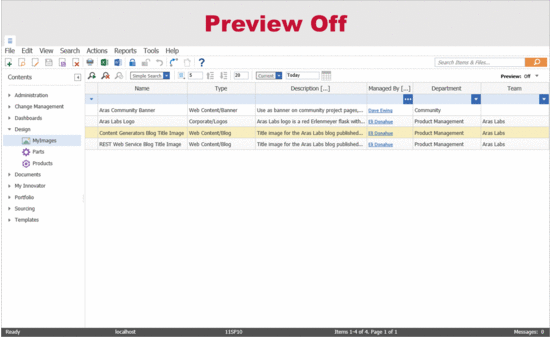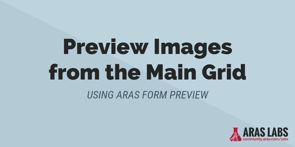 In Aras Innovator 11 SP9, Aras introduced the new Form Preview feature to the main grid. This allows users to select a row and see the item's form in a preview pane on the main grid. Administrators can also configure custom "preview" forms that are rendered in the preview pane instead of the ItemType's default view form. In this post, we walk through how you can take advantage of the Form Preview feature and custom forms to implement an image previewer.
