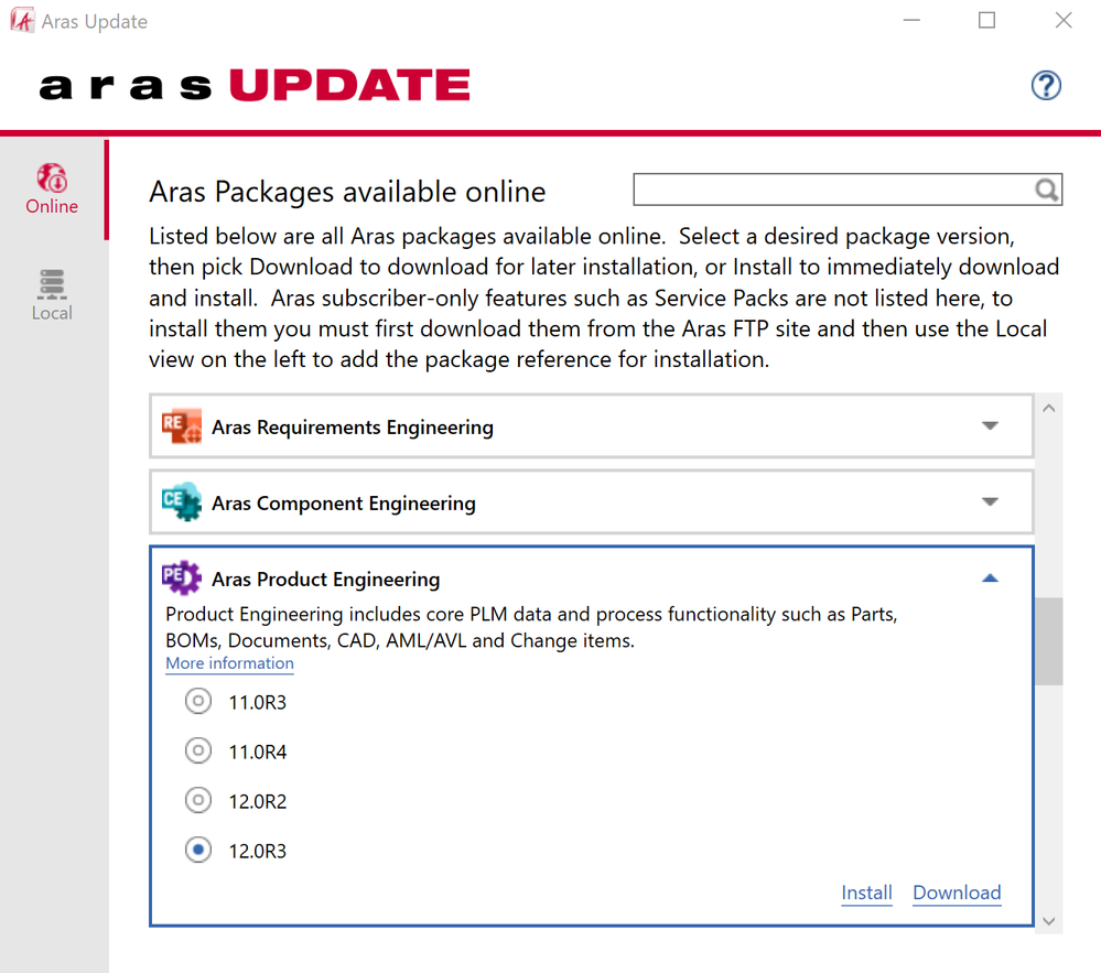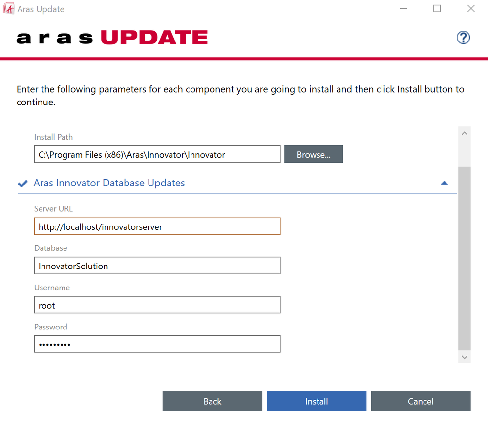 First you’ll need to download Aras Update. Aras update makes it easy to install our applications without having to manually perform imports or code tree changes. You can download it here. Once you’ve downloaded and opened it, you should see a list of applications you can download and install. For this blog I’m going to download and install PE 12R3, the latest released version of Product Engineering. Once you’ve downloaded the package locally, press install and you’ll be prompted for some information. For our default installation of innovator, here is what your screen should look like.