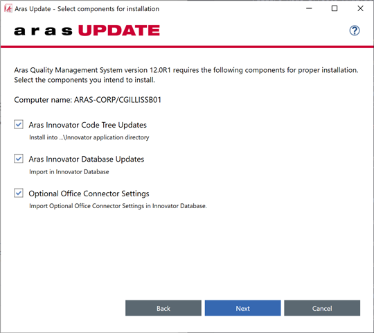 QMS can be easily installed using the Aras Update utility. Once you've installed Aras Update, you can open it to see a complete list of the applications available for installation. From this list, we can select Quality Management System and choose to install 12.0R1. After clicking install, you should be taken to a page like the one below.