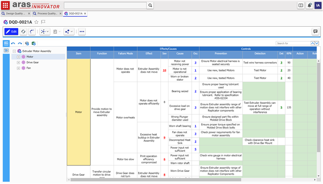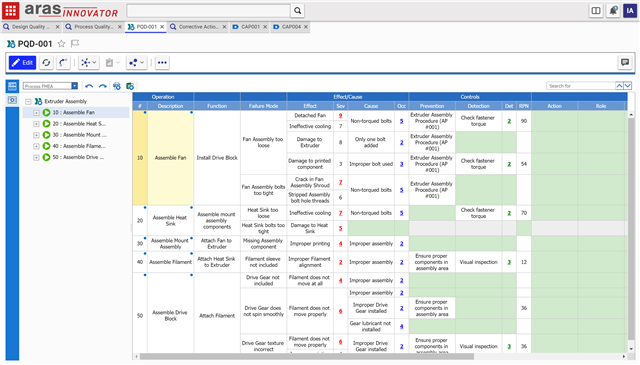 Another helpful view is the Process FMEA which helps you track potential issues with the steps in your process such as a bolt being made too tight or too loose during assembly.