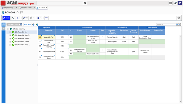 The PQD is intended to track information on the manufacturing process of your products. In fact, PQDs can be linked directly to a Process Plan item if you're also using the Manufacturing Process Plan application. The PQD also comes with a few different views to help you visualize your process. The first one you'll see is the Process Control Plan, and it is intended to just provide a general overview of each step in your assembly.