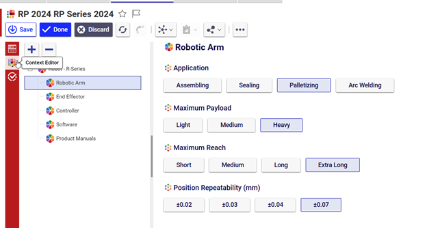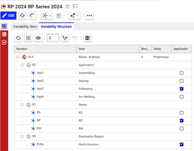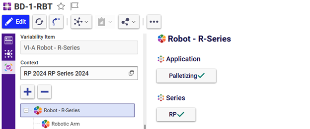 This is also visualized more clearly in the Configurator Context ItemType within the Variability Structure Tree Grid View. Here you can see that for the same RP Series Robot Arm, we can quickly see which options for each feature applies to the given context: