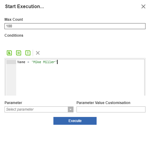 To test our query, we can run Actions > Execute Query from the toolbar of our Query Definition tab. This will bring up a dialog that lets me enter some additional criteria to filter the query. I'll choose to run this query just against Mike Miller, so I can more easily compare the results to what my membership report returned.