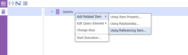 Once we're in the editor, we can start building out our query. We can right-click on the root Identity node of our definition and select Add Related Item > Using Referencing Item... .