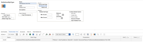 Two of these parameters are set in such a way that they will be automatically populated based on the Item that the user is currently viewing: 'ITName='+itemTypeName+'&itemID='+itemID+'. This means that for most use cases, the only parameters you'll need to change will be reverseITName and reverseRelationshipName. For example, we could add a new relationship to Part that allows Users to see what Assemblies the Part they're viewing is in. If we did this, our Parameters for this RelationshipView would be as follows.