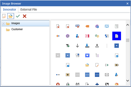 Open up the target ItemType for editing, and click Select an image... under the small icon field. Once the image browser has loaded, click the Open File icon on the External tab. Navigate to the customer folder at [Install Path]InnovatorClientcustomer and select your custom SVG file. Repeat the same steps for the large icon field and save the ItemType.