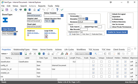 The second option is to login to Aras and view the images with the image browser. To do so, open up your ItemType for editing and click Select an image... under the small icon or large icon fields. Once you've chosen an image you want to use, we need to determine the file name. Right click on the icon in the image browser, select Properties (or Inspect, depending on your browser), and make note of the file's name.