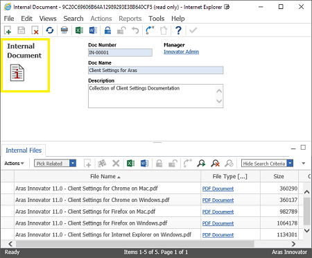 Aras provides a collection of built-in SVG images for use in ItemTypes, forms, documents, and more. While the default images fit a range of use cases and needs, you may have a scenario that requires a custom ItemType icon. In the steps below, we will create a custom icon for the Internal Document ItemType, based on the default Document icon.