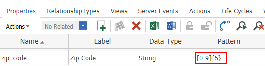 We want all of our zip codes to be exactly 5 characters. Each character should be a number between 0 and 9. With these rules, we can specify the Pattern of our Zip Code property to be the following Regular Expression: [0-9]{5}