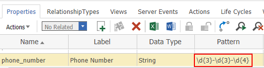 Let's go back to our Client ItemType and take a look at the Pattern column in the Properties grid. By writing a Regular Expression or Regex into this column, Innovator will ensure that all data for this property matches the Regular Expression. If you are new to Regular Expressions, there are a number of different helpful tutorials and guides you can find online including this one: https://www.regular-expressions.info/index.html .
