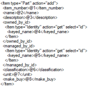 When authoring templates, bind columns with N. Start with add for initial loads. For recurring loads, consider switching to merge with a where clause (e.g., keyed name) so existing items update safely without colliding with sensitive properties. For structures, load Items first, then Relationships (e.g., Part BOM), or use an advanced template that edits a Part and adds its BOM lines in one pass. For documents, consider loading the Document and its File together in the same template to avoid dangling relationships.
