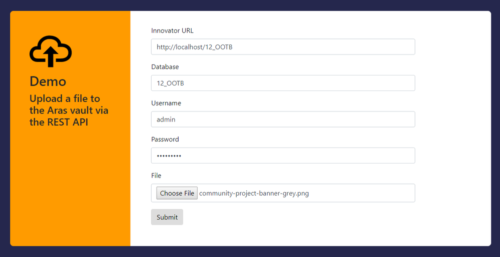 If you want to see how you can use these HTTP requests in code, check out the rest-upload-example project on the Aras Labs GitHub. The project provides a simple HTML form that allows the user to enter the credentials for an Aras Innovator instance and select a file to upload. The included submitForm() JavaScript function authenticates the user and uploads the file to the specified vault via the HTTP requests covered below.