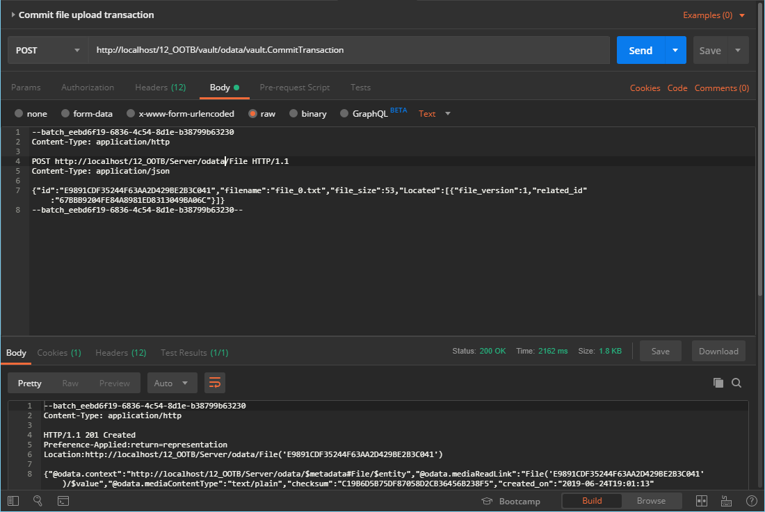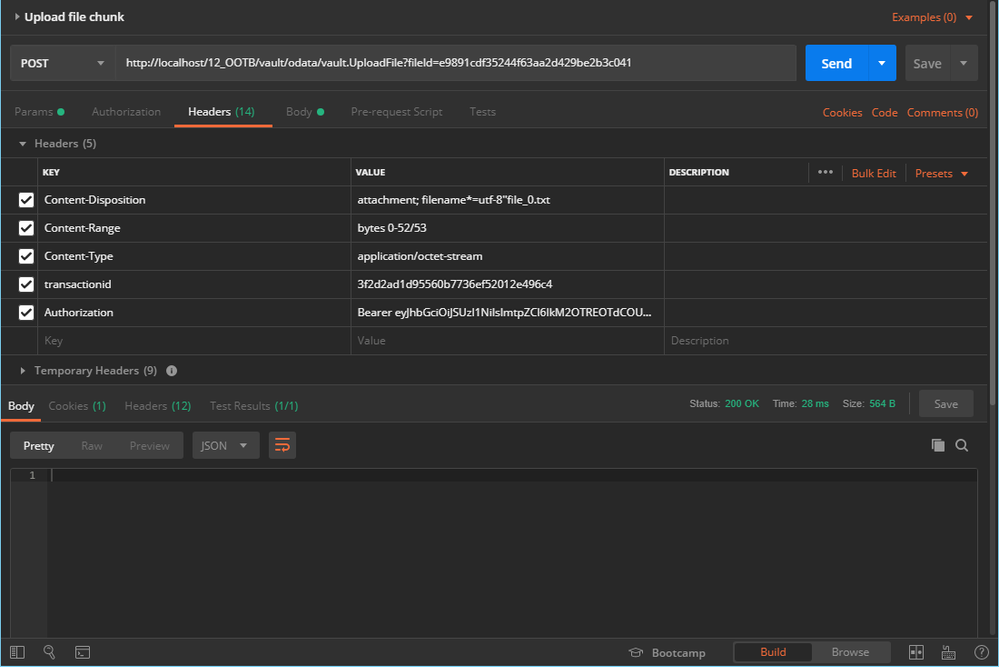 Now that we have started a transaction with the vault server, we can start uploading the file. In this example, we're uploading a small, simple text file to Innovator with a single HTTP request. However, you can also upload a file in "chunks" if you have a large file or network constraints. The uploadFile() function in the rest-upload-example community project demonstrates how you can programmatically split your file upload into multiple requests.