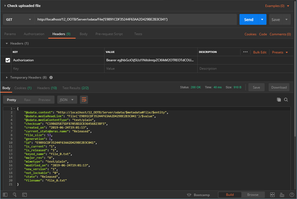 The commit request will return some metadata about the new File item, but you can perform a GET request if you want to get specific metadata. The screenshot below shows how to request a File item from Innovator, just like any other ItemType. You can also retrieve the contents of a file by adding "/$value" to the end of the request url.
