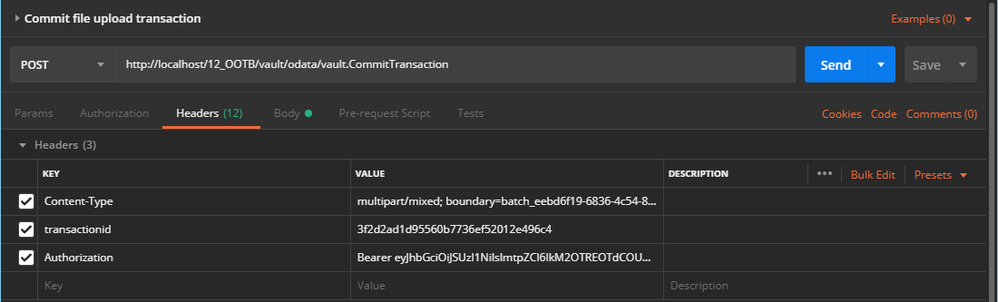 The headers of the vault.CommitTransaciton request are pretty straightforward. We'll use the same transactionid and Authorization headers that we used to upload the file contents, however the Content-Type header will look a little different.