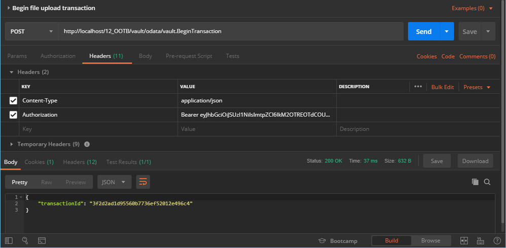 The first step to upload a file to Innovator is to get a transaction id from the vault server. All we need to do to is send a POST request, authenticated with our token, to the vault.BeginTransaction endpoint. The result will be a JSON object with a "transactionId" property.